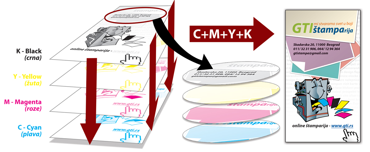 Sistem kolorne ofset štampe. Obratiti pažnju na uklapanje crnog teksta (adresa) sa kolornom podlogom.