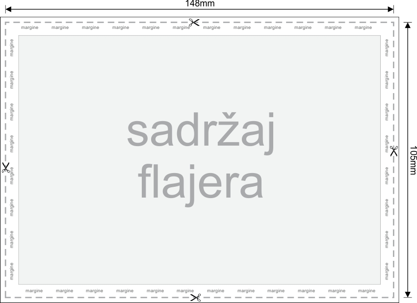 - Sav bitan sadržaj (adresa, tekst, ime firme, logo i sl.) je u pripremi potrebno odmaći bar 7mm od ivice, što zbog estetskih razloga, što zbog izbegavanja da se prilikom obrezivanja flajera ne odseče nešto od toga.