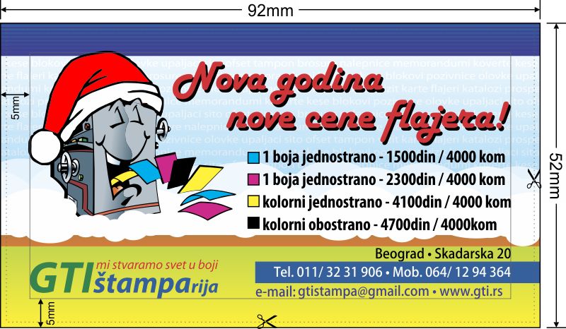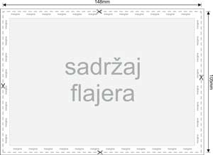 - Flajer pripremiti u konačnoj dimenziji, plus 2mm sa svake strane. Na primer, ako je flajer u dimenzijama A6 (105mm x 148mm), pripremu je potrebno raditi u formatu 109mm x 152mm.