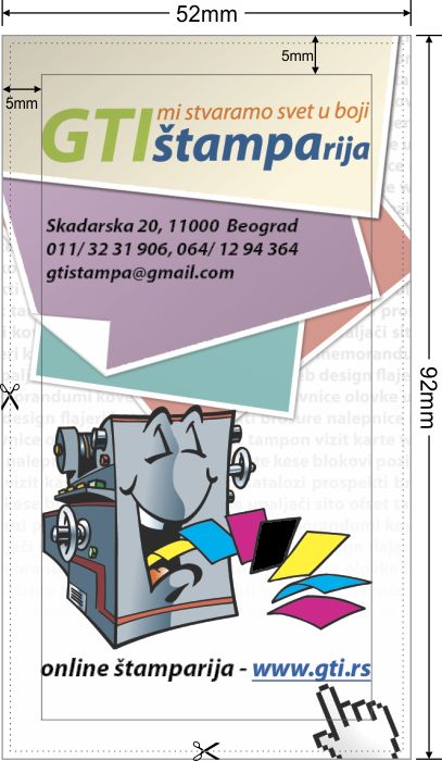 - Sav bitan sadržaj (adresa, ime, logo i sl.) je u pripremi potrebno odmaći bar 5mm od ivice, što zbog estetskih razloga, što zbog izbegavanja da se prilikom obrezivanja vizit karte ne odseče nešto od toga.